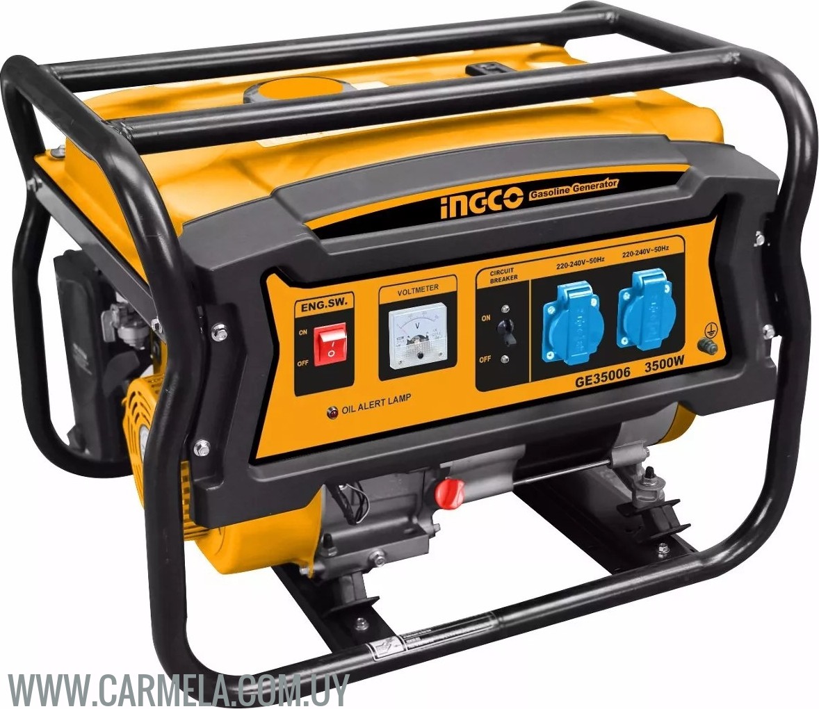 Generador a nafta con motor de 4 tiempos y 7HP con capacidad para entregar hasta 3500 watts de corriente (220V 50Hz). Con tanque de combustible de 15lts de capacidad.